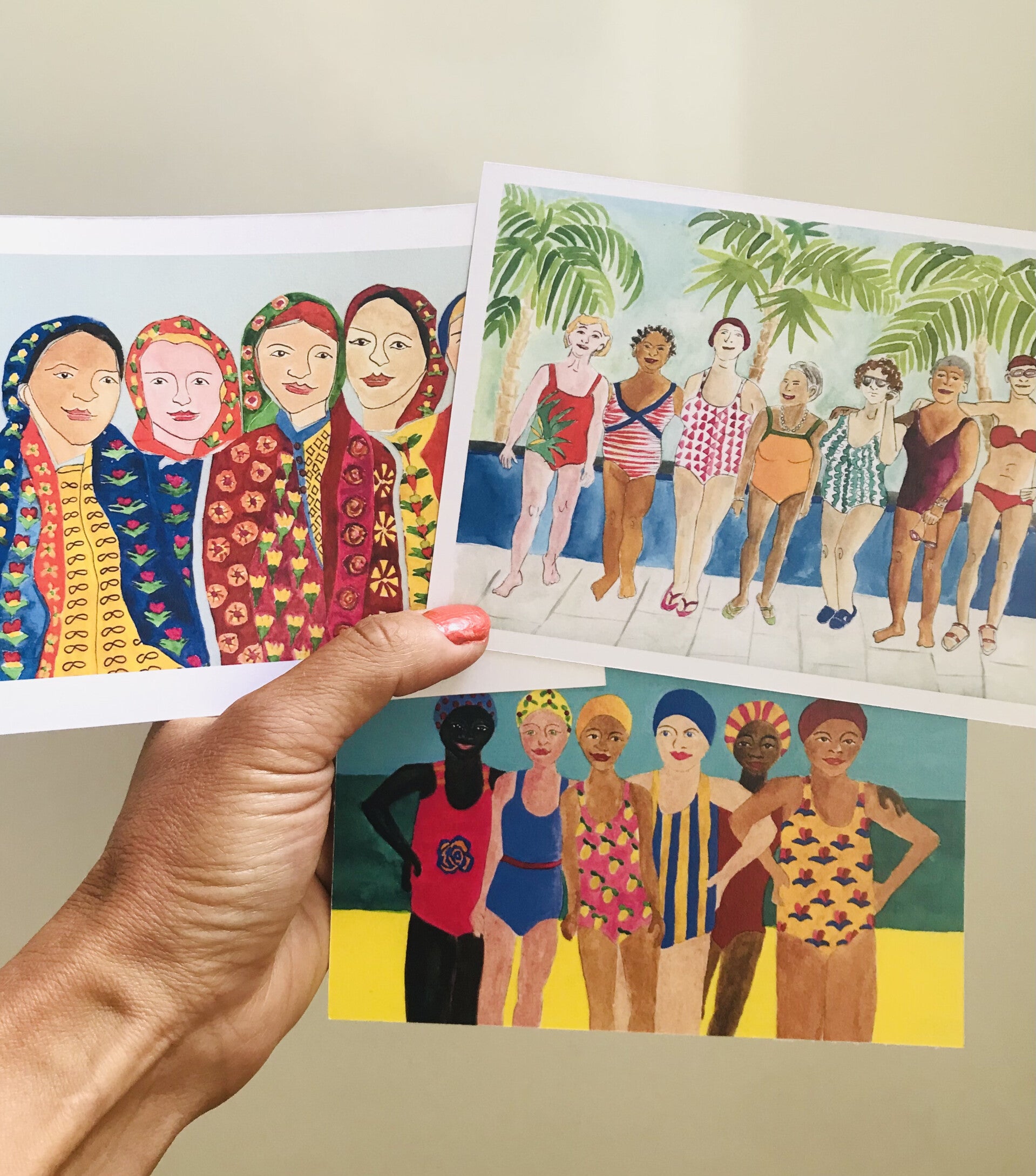 'Sisterhood' bestaat uit een set van 4 kleurrijke kaarten van ongeveer ansichtkaartformaat met blanco achterzijde.